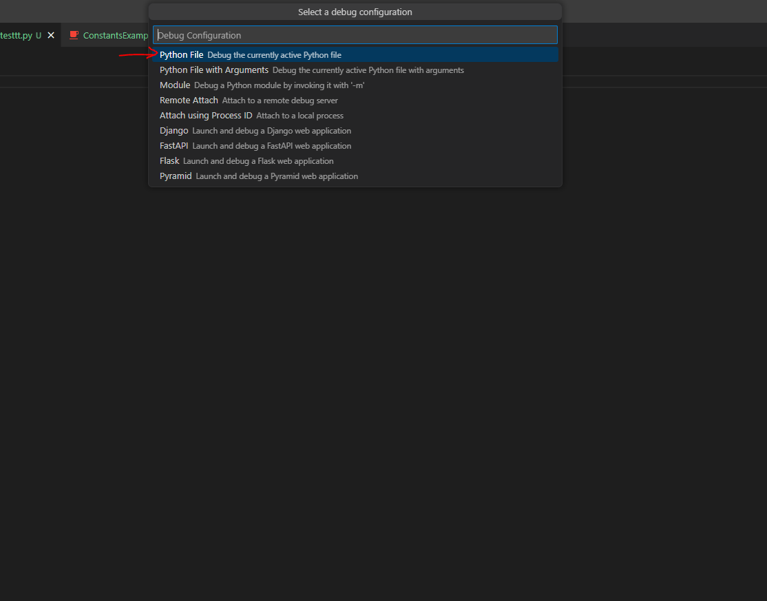 Run and Debug 패널에서 "Create a launch.json file"을 클릭하여 디버그 설정 파일을 생성합니다. 팝업 창에서 "Python File"을 선택합니다. 그러면 .vscode/launch.json 파일이 생성됩니다.